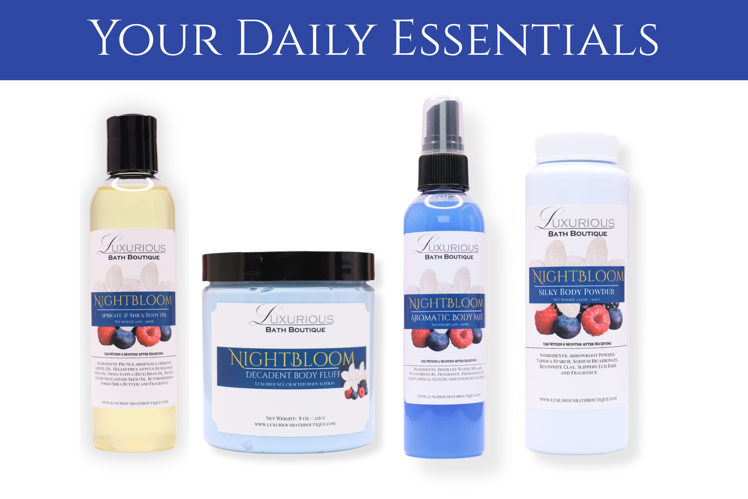 Soaps. Lotions. Mists. Oils. Powders and more! Click “Shop” in the menu bar to explore your daily essentials.